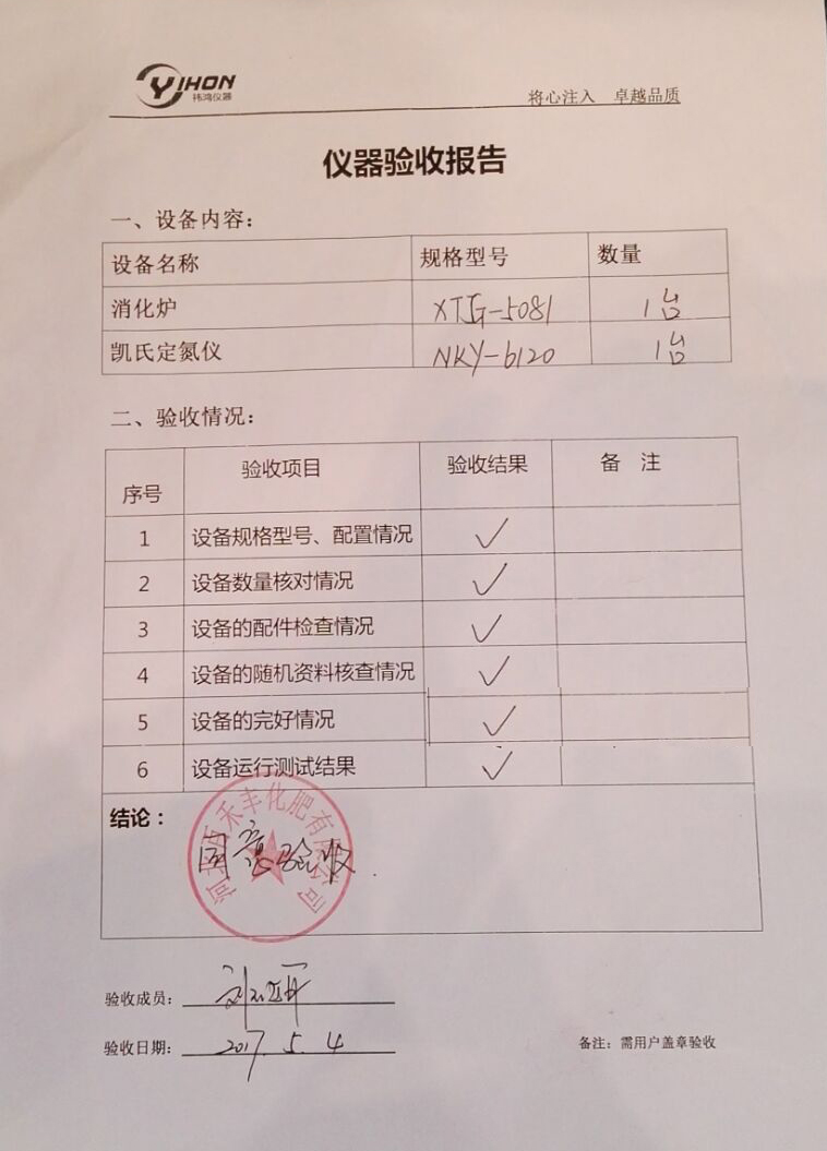 由上海祎鴻提供的NKY6120全自動定氮儀和XTG5081碳纖維紅外消解儀,解決了化肥中硝態氮、常規氨氮的測試需求。百禾豐化肥實驗室主任對祎鴻定氮儀產品給予了高度的評價,可靠、穩定的解決了用戶的實驗需求。